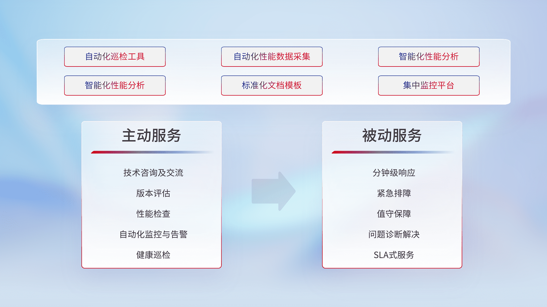 智能化工具和标准化文档,,,,保障服务质量,,,,提供主动服务(包含技术咨询、、版本评估、、性能检查、、、、自动化监控与告警、、、健康巡检)和被动服务包含(分钟级响应、、紧急排障、、、值守保障、、问题诊断解决、、、SLA服务)。。。