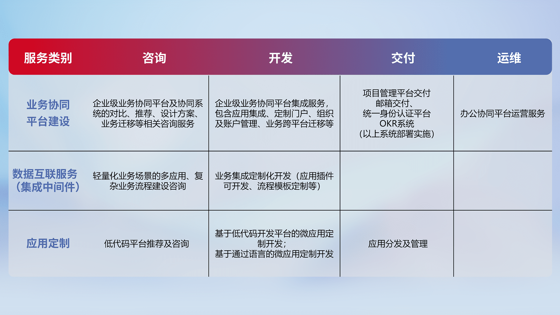 针对钉钉、、、、企微、、、IDaas等平台级产品提供产品的规划、、、、方案、、交付、、定制化开发等服务,,实现如统一协同办公、、智能客户服务、、、混合会议管理、、智能数据查询、、、、等业务场景,,实现数字化转型。。。
